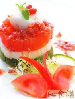 4.取盘,依序排入作法2的酪梨块、蕃茄块及作法1的鲜贝,再将作法3的酱汁淋上即可享用。