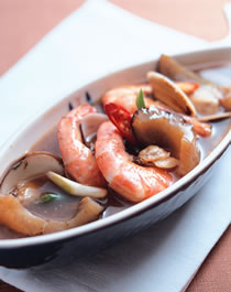蚌壳300公克,虾子300公克,牡砺200公克,葱2根,猪脚卤汁500㏄,姜片3片,绍兴酒100㏄