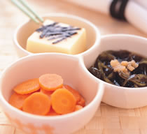 蛋豆腐20公克,红萝卜片20公克,海带丝25公克,海苔丝少许,a.盐适量,b.素蚝油1大匙,柠檬汁5cc,姜汁10cc,鲜味露适量,香油适量