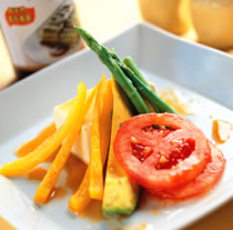 4.将豆腐、酪梨、芦笋、蕃茄、黄甜椒摆盘,最后淋上作法3的沙拉酱汁即可。