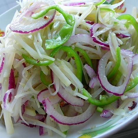 紫色的洋葱半个,土豆切丝。也是半个,柿子椒一个,辣椒油,盐,鸡精等调味食量。根据个人口味。