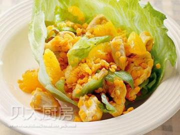 将鸡肉片、生菜丝、滨豆和橙子肉混合均匀放入盘中。