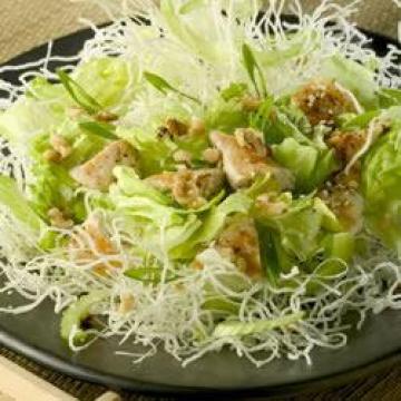 无骨半鸡胸肉3.5个,煮熟切丁,生菜1棵,撕成小片,洋葱4个,切片,芹菜4根,切薄片,胡桃60克,捣碎,熟芝麻20克,中式面条170克,短时间加热到变脆,调味米醋90毫升,白糖50克,盐6克,花生油120毫升