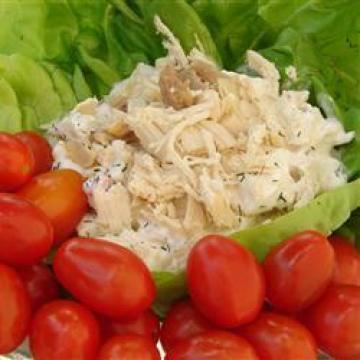 淡蛋黄酱120克,苹果醋30毫升,大蒜2瓣,切碎,新鲜莳萝45毫升,切碎,熟鸡胸肉450克,去皮,去骨,切丁,红辣椒1个,切碎,碎费塔奶酪(或其它奶酪)30克
