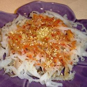 2.在拌盆中,倒入冷却的牛百叶丝,加盐、辣椒油、香油、大蒜、胡椒粉、酱油、醋、味精拌匀装盘,撒上芝麻即成。