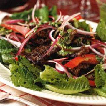 3.在沙拉碗或浅盘中拌合长叶莴苣、甜椒和洋葱。放入牛肉,淋上沙拉酱即可。