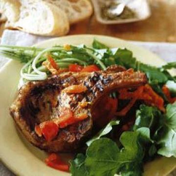 茴香籽11/4茶匙,小茴香粉3/4茶匙,香菜粉(芫荽粉)3/4茶匙,盐3/4茶匙,瘦猪排(每块约厚2厘米,重168克)4块,橄榄油4茶匙,新鲜柠檬汁3汤匙,第戎芥末1茶匙,芝麻菜(又称紫花南芥)500克,去掉老茎,李子番茄4个,切丁,杏干35克,切丁