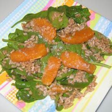 糙米280克,水750毫升,橙汁150毫升,初榨橄榄油2汤匙,香醋2汤匙,蜂蜜2汤匙,橙皮2茶匙,盐1/2茶匙,菠菜叶150克,大橙子2个,去皮剖开,切成片,紫洋葱半个,切成片