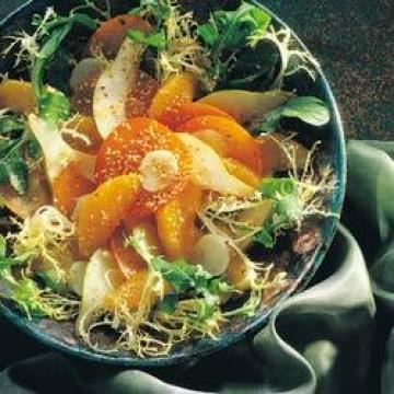 4.上桌时,将梨与剩下的柿子去皮切片。从冰箱中取出沙拉酱、橙子块、荸荠。用叉子搅拌一下沙拉酱,然后拌入沙拉菜叶,放在大餐盘中。以橙子块、荸荠、柿子、梨子等点缀,撒上烘焙好的芝麻,立即上桌。