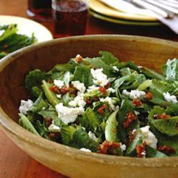 3、取一沙拉大碗,将酸醋酱拌入莴苣,撒上羊奶奶酪即可。