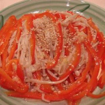 2.将金针菇、柿椒丝在沸水中烫1分钟;捞起冲凉,沥干水分,用精盐、味精、大蒜末和香油拌匀,装盘中即成。