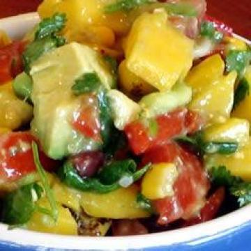 2.用个沙拉碗, 把黑豆、玉米、牛右果、辣椒、西红柿、葱和香菜拌匀。把刚才准备好的柠檬调料再摇晃几下, 然后倒在沙拉上。搅拌沙拉使调料均匀沾在蔬菜和黑豆上面。