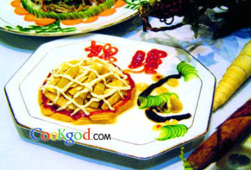 5、将拌匀后的春笋放入用玉米笋摆好的造型中,然后将用炼乳和沙拉酱调好的酱挤在拌好的春笋上成十字花形,果酱挤在玉米笋上成丝状。