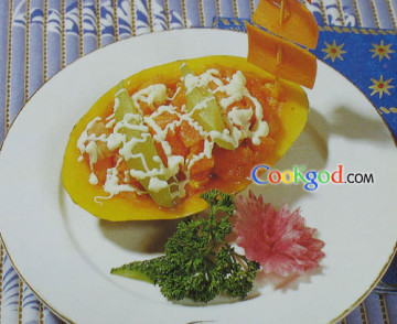2、把木瓜肉、青瓜切成菱形,放在木瓜船里,浇上丘比沙拉酱即成。