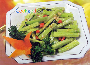 2、在瓜条中加适量精盐、味精、白糖、醋、熟白芝麻、蒜泥和辣椒油、枸杞拌匀即可装盘上桌。