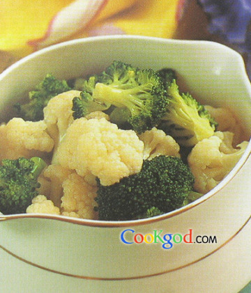 菜花200克,西兰花200克。调料精盐1/2小匙,味精1/2小匙,蒜泥少许,葱油1小匙。