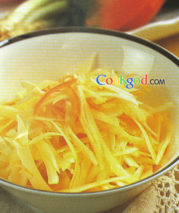 大白菜帮500克,橘子皮少许。调料柠檬汁适量,精盐少许,糖1小匙,白醋1小匙。