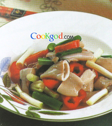 1.海兔洗净后,放在滚水里焯一分钟,立即捞出控干待用。