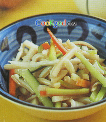 鲜鱿鱼丝200克,黄瓜丝100克,红、白萝卜丝各50克,青、红椒丝各50克。调料精盐1/2小匙,味精1/2小匙,辣油1/2小匙,葱油1小匙。