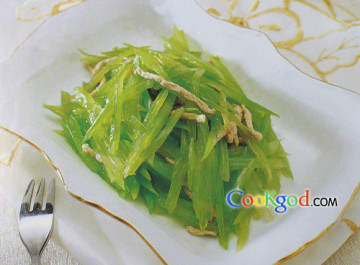 2、芹菜择去根、叶,洗净,放入开水中烫透捞出,晾凉,斜切成细丝,拌入肉丝内,加入精盐、味精拌匀。