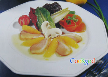 材料烟熏鸭胸、混合生菜、蘑菇片、番茄花、小红萝卜、橙肉、橙汁、甜橙酒、油醋汁、混合香料