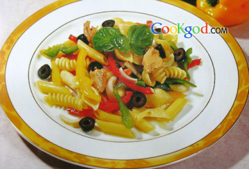 材料各式意粉、青椒、黄椒、红椒、洋葱、黑水榄、金枪鱼柳(听装)、油醋汁、橄榄油