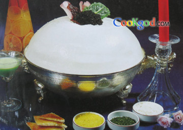 (3)在冰块的圆底上用圆勺烫出一个洞,垫入生菜,放上鱼子酱,置于盆内。