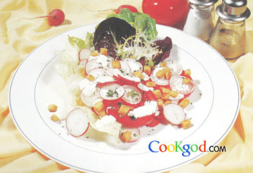 (4)将混合生菜垫在盆内,放上番茄片,再铺上小红萝卜片,撤上面包粒,淋入酸奶汁,最后撒上芜荽碎即可。