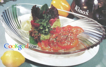 (2)装盆时,用混合生菜垫在盆底,上面铺上番茄片,淋上油醋汁,撤上洋葱粒即可。