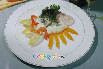 主料:鲜鱿鱼200克,鲽200克,蟹肉200克,辅料:胡萝卜50克,圆白菜50克,红尖椒30克,调料:色拉酱50克