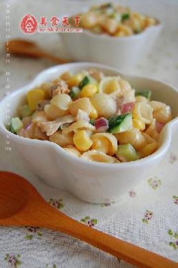 贝壳通心粉、罐头金枪鱼(天然泉水浸)、黄瓜、洋葱、玉米。