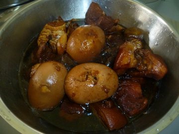 [卤肉] ..........做法:3层肉一条洗净切两段腌黑酱油备用 取干净的锅放2汤匙白糖开小火不停的拌炒至白糖变糖浆 加水待水滚 拍一块姜 少许蒜米和肉一起放下去 水要加到盖过肉 水滚转文火焖至肉轻 取肉切片调味就可以了 在煮的过程中 也可以放剥了壳的蛋或炸过的豆干一起煮 蛋煮时要小心不要弄破…