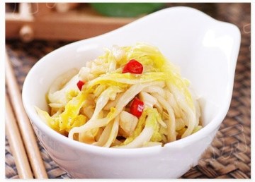 2.腌好的白菜冲洗几遍,挤干水份。加入蒜碎,辣椒碎,醋,可根据口味调适量生抽,香油,拌匀即可。