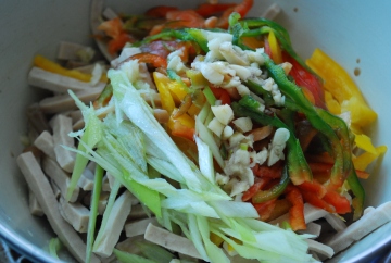 2.豆干洗净切片再切丝;西芹去皮、茎,切丝,皆做烫熟减菌动作后泡凉沥干备用。