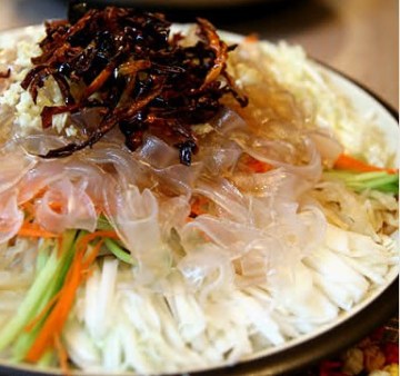 1.白菜片片切丝、即食海蜇两袋洗净、台湾宽粉条煮熟,过冷水后剪段儿和白菜丝一起摆盘、黄瓜胡罗葡做点缀;