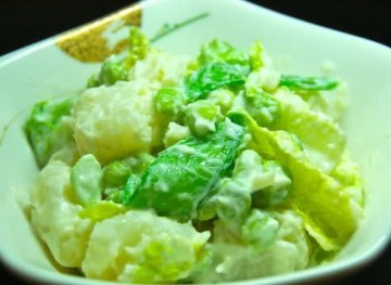 5、把土豆、毛豆、雪豆和生菜用山葵蛋黄酱拌匀,调味,即可。