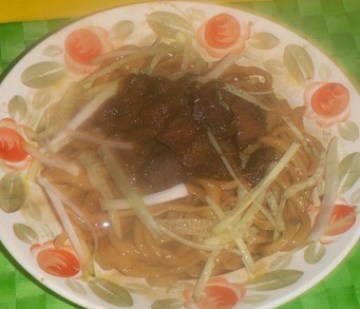 2.将水烧开(水要多),下面煮熟捞出,分别盛入2大盘中,拌入拌料1,浇上红烧肉b