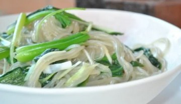3、将菠菜和红薯粉条以及蒜茸花椒油盐镇江香醋拌匀,生葱丝至顶。
