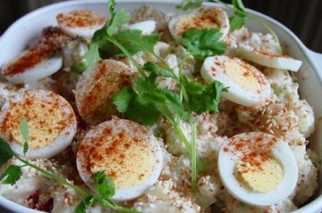 熟鸡蛋切片放在沙拉上,洒些辣椒粉,芝麻,最后用香菜点缀。