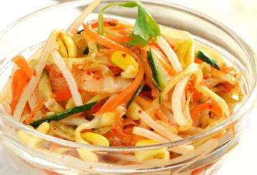 材料:黄豆芽250克,黄瓜1根,胡萝卜1根、辣白菜250克,蒜3瓣