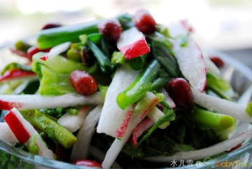 刺嫩芽先开水焯好,水萝卜切条,葱切段,