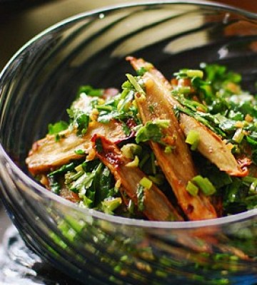 4.香菜切碎,放入炸好的牛蒡,把调味汁浇上,淋一些麻油,拌匀就可以了