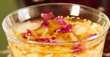 吃的时候从水里捞出米凉虾,加入红糖稀和玫瑰糖,再加几块碎冰块,面上撒点香芝麻就好了.