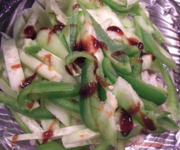 2黄瓜去皮切丝,青椒洗净切丝。
