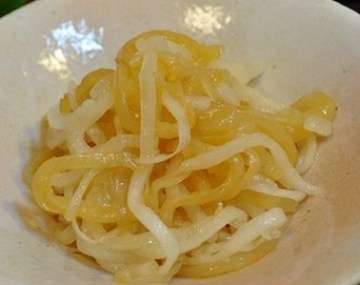 2、白萝卜切丝,用盐腌至出水,挤干水,放在海蜇上,加盐、糖调味拌匀。