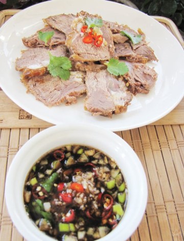 3.把油烧热后蒜茸,姜茸,把(1)倒入,煮开后洒入葱花,香菜粒, 拌匀后淋在切成薄片的牛肉上.就可起筷.