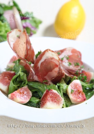 无花果4个,生火腿4片,洋葱末5克,芝麻菜15克,水芹菜叶15克,橄榄油少许,法式沙拉酱35克,红辣椒油适量,白醋5克,盐2克,胡椒2克,柠檬汁15克,荷兰芹末少许,