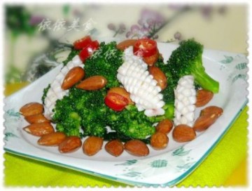 第一种:凉菜菜谱西蓝花鲜鱿鱼拌杏仁做法
