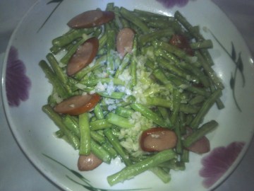 3、锅烧热放油下蒜蓉(半茶匙)爆香、 再放豆角、糖、盐、调味料炒一下关火,最后把剩下的蒜蓉都倒进出拌均就可以了。
