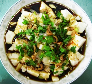 3、锅内放少许油,把海米略炸一下,捞出,撒在豆腐上。